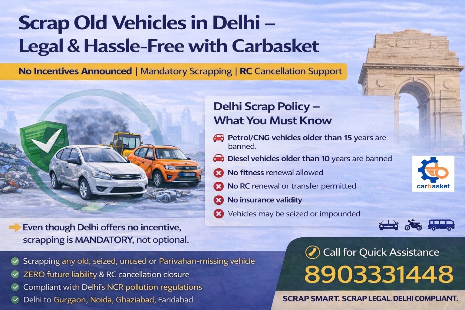 Even though Delhi offers no incentive, Carbasket ensures a smooth legal exit from old or banned vehicles.