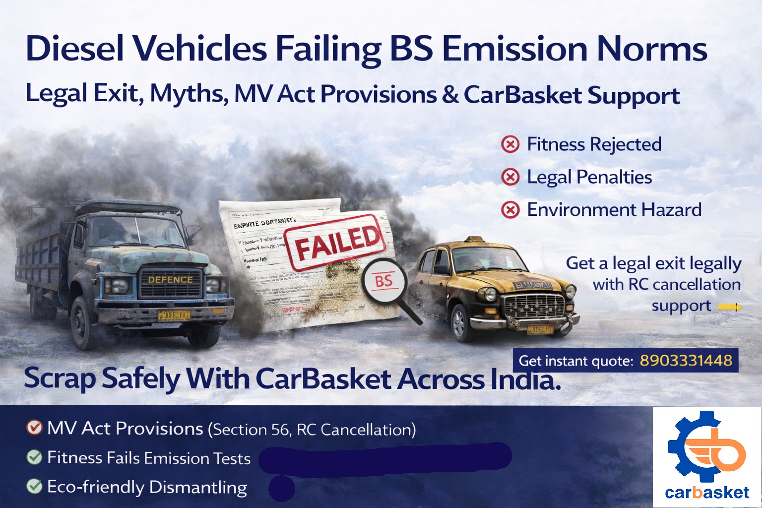 This guide explains why diesel vehicles fail BS norms, what the Motor Vehicles Act (MVI Act) says, common myths vs facts, and how Carbasket helps vehicle owners exit legally through RC cancellation support and certified scrapping.