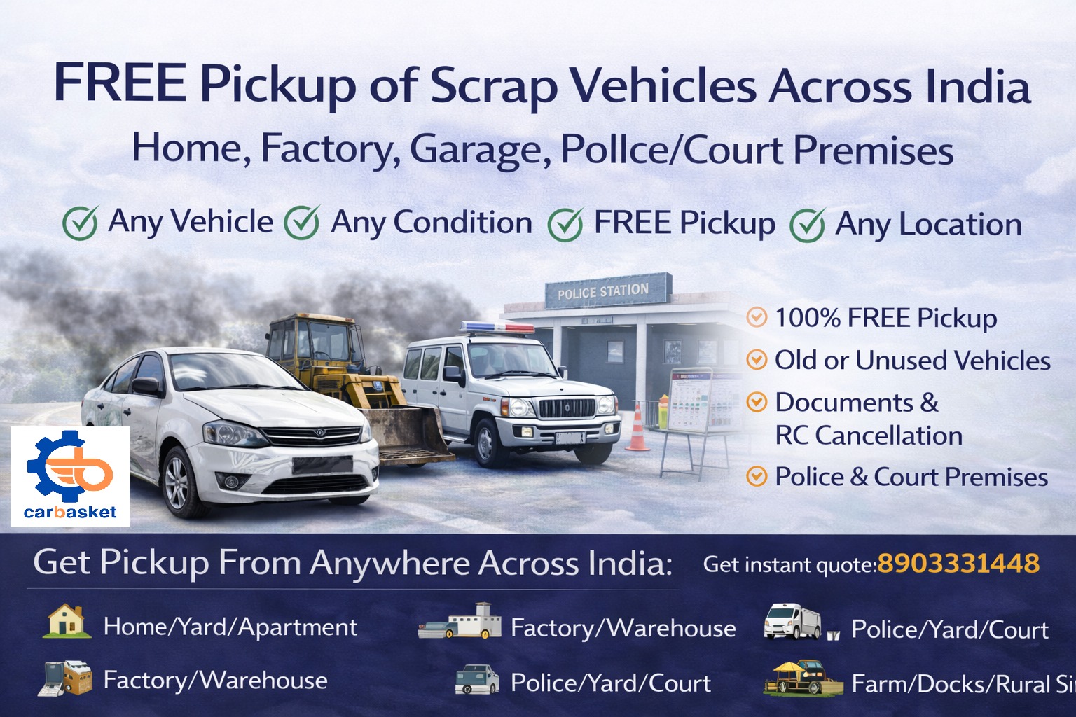Old, unused, damaged, or legally stuck vehicles often become a burden instead of an asset. Whether your vehicle is parked at home, lying idle in a factory yard, seized at a police station, abandoned in a garage, or held in court premises, Carbasket provides doorstep scrap vehicle pickup anywhere in India, fully aligned with the Government of India’s Vehicle Scrappage Policy.